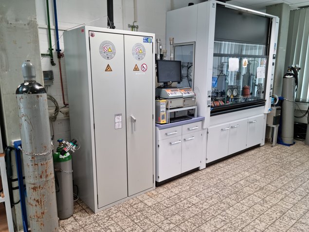 Das Labor ist für den sicheren Umgang mit brennbaren Gasen unter Hochdruckbedingungen ausgelegt. Es verfügt über umfangreiche sicherheitstechnische Maßnahmen wie: