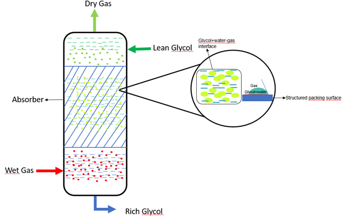 The interfacial behavior of TEG-water in the presence of compressed gases in a packed column is vital to the performance of dehydration in packed columns. The mass transfer area depends on how the fluids wet the packing. Wettability is characterized by the contact angle at the three phase contact of liquid-gas-solid. Through the Young´s relation, the contact angle is related to the interfacial tension between the fluid phases and the respective interfacial energies in contact with the solid surface. Understanding these interfacial properties at the relevant operating conditions in the contactor (TEG-water-(natural) gas) and the regenerator (TEG-water) is a key to improving the efficiency of this type of separation process. Within this project for all relevant parameter combinations and concentrations are experimentally investigated and observed in high pressure view chambers.