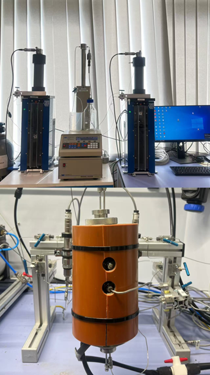 Our core flooding setup is a dual-purpose tool designed for reservoir evaluation and caprock sealing capacity assessment. It precisely simulates subsurface conditions (up to 300bar and 120°C) to analyze fluid flow through core samples, providing critical data on permeability and two-phase flow properties- essential parameters for reservoir management.