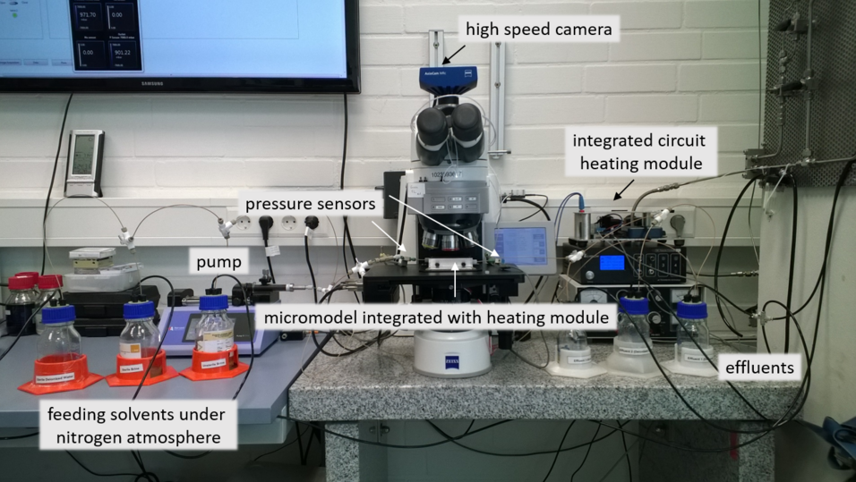 Mit sechs verschiedenen Vergrößerungslinsen bietet dieses Mikroskop die Möglichkeit, entweder das gesamte Mikromodell oder einzelne Bereiche innerhalb des porösen Mediums abzubilden. Darüber hinaus verfügt die Anlage über ein integriertes Datenerfassungssystem und eine Heizvorrichtung (max. 120 °C). Für die Untersuchung mikrobieller Prozesse wurde ein Bildverarbeitungsalgorithmus entwickelt, um Veränderungen der mikrobiellen Dichte im Zeitverlauf zu quantifizieren. Die Messung der Gaszusammensetzung innerhalb des Systems kann mithilfe eines Gaschromatographen auch bei sehr geringen Fließraten (µl/min) durchgeführt werden.